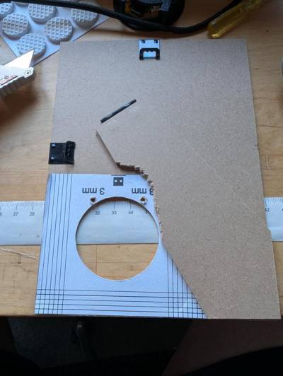 - Drei Löcher bohren (2 für die Justierung und eins inmitten der Displayöffnung, um im nächsten Schritt das Sägeblatt der Laubsäge dort einzuziehen). Beim Bohren eine feste Unterlage benutzen, damit die Pappe nicht nach unten nachgibt und wegreisst.